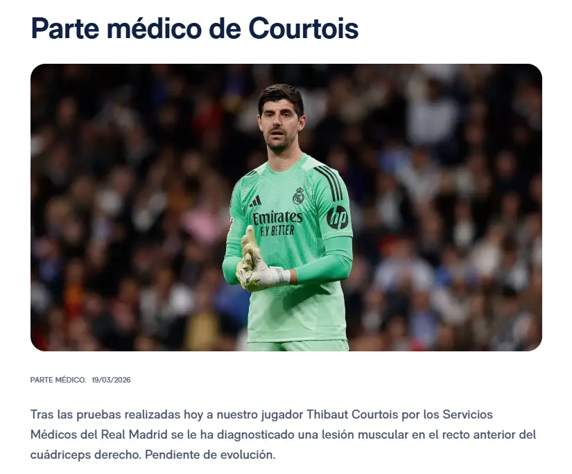 《阿斯报》指出,原本以为,库尔图瓦只是肌肉负荷问题,缺席周日的西甲马德里德比。不过,库尔图瓦的伤情比想象中严重,他需要6周时间养伤。从赛程来看,库尔图瓦至少缺席皇马未来8场比赛: