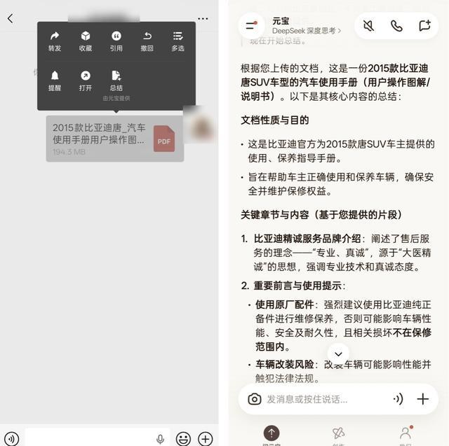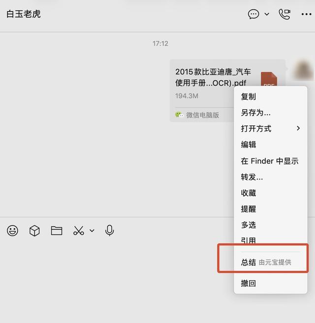 在手机端,我们长按选定一份文件后,便会出现“总结”选项,该选项底部还有“由元宝提供”字样。点击“总结”后,就会从微信跳转到元宝,并由元宝的AI进行总结。