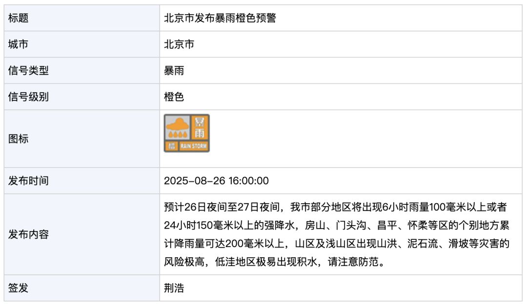 8月26日16时专业配资网站,北京市发布暴雨橙色预警: